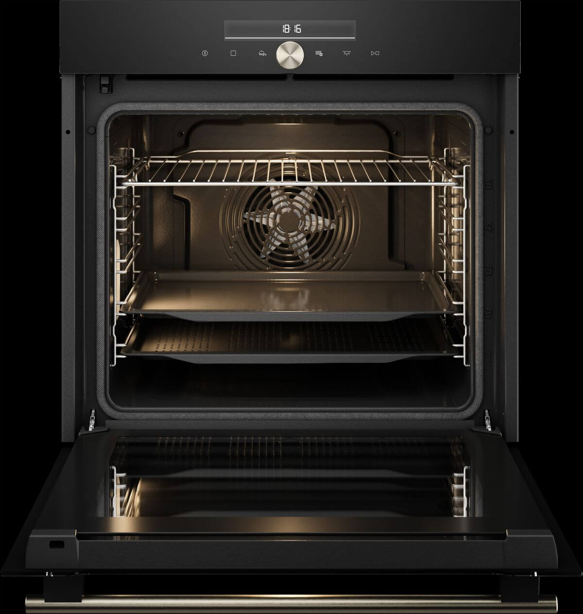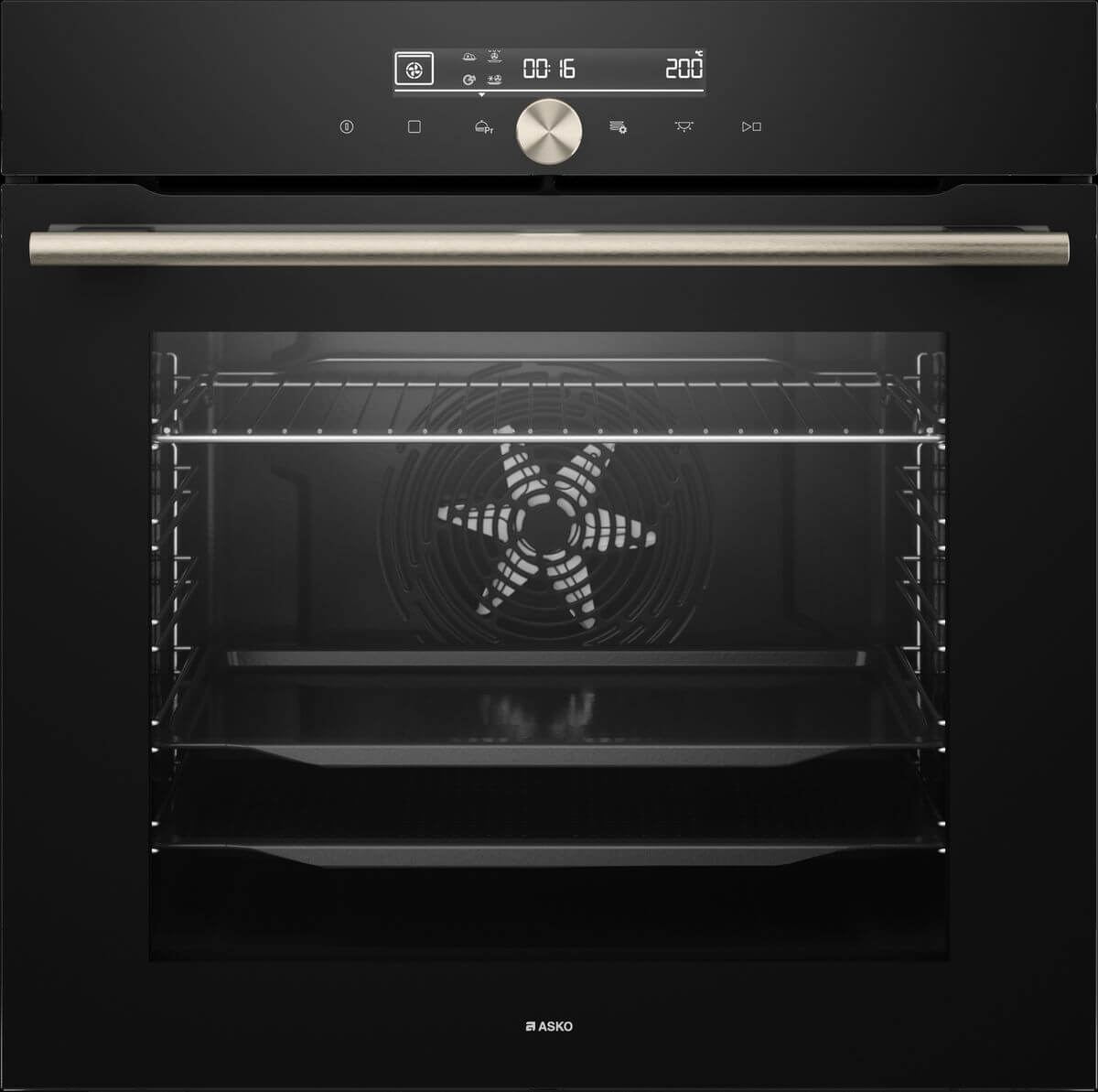 Marke: ASKO, Backofen Pyrolyse Black Glass EURO, Breitennorm: 60 cm, Reinigung: AquaClean; Pyrolytisch, Display: digital, Steuerung: Drehknopf; intuitive Tasten- und Touchscreen-Navigation, Anzahl Funktionen: 12, Anzahl Programme: 22, Schnellvorwärmung, Auftauen, Wiedererwärmung, Tellererwärmung, Sabbat, Aqua clean, Pyrolyse, Türtyp: Gedämpfte Schliessung; Innentüre Vollglas, Anzahl Backebenen: 5, Beleuchtung: Ja; Halogenlampe: G9; 230 V; 25 W, Farbe: Glassfront schwarz, Anzahl Gläser: 3, CoolDoor, Nutzinhalt Gesamt: 77 l, Energieeffizienzklasse: A+, Strom: 16 A, Leistung: 3’500 W, Anschluss: 230 V; PN