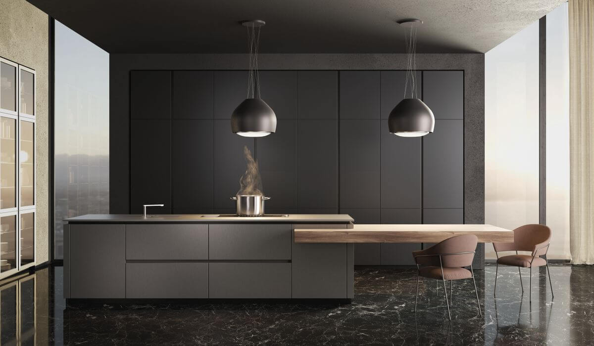 Marke: FALMEC, CircleTech, Einbauart: Inselhauben; Mit Kabeln an der Decke befestigt, Umluft, Randabsaugen, Farbe: Anthrazit, Beleuchtung: Ja; LED Strip 18W (4200K), Geräuschwert: 60 dB(A) re 1 pW, Luftmenge (Förderleistung): 600 m³/h, Anzahl Geschwindigkeiten: 4, Strom: 10 A, Anschluss: 230 V, Leistung: 160 W