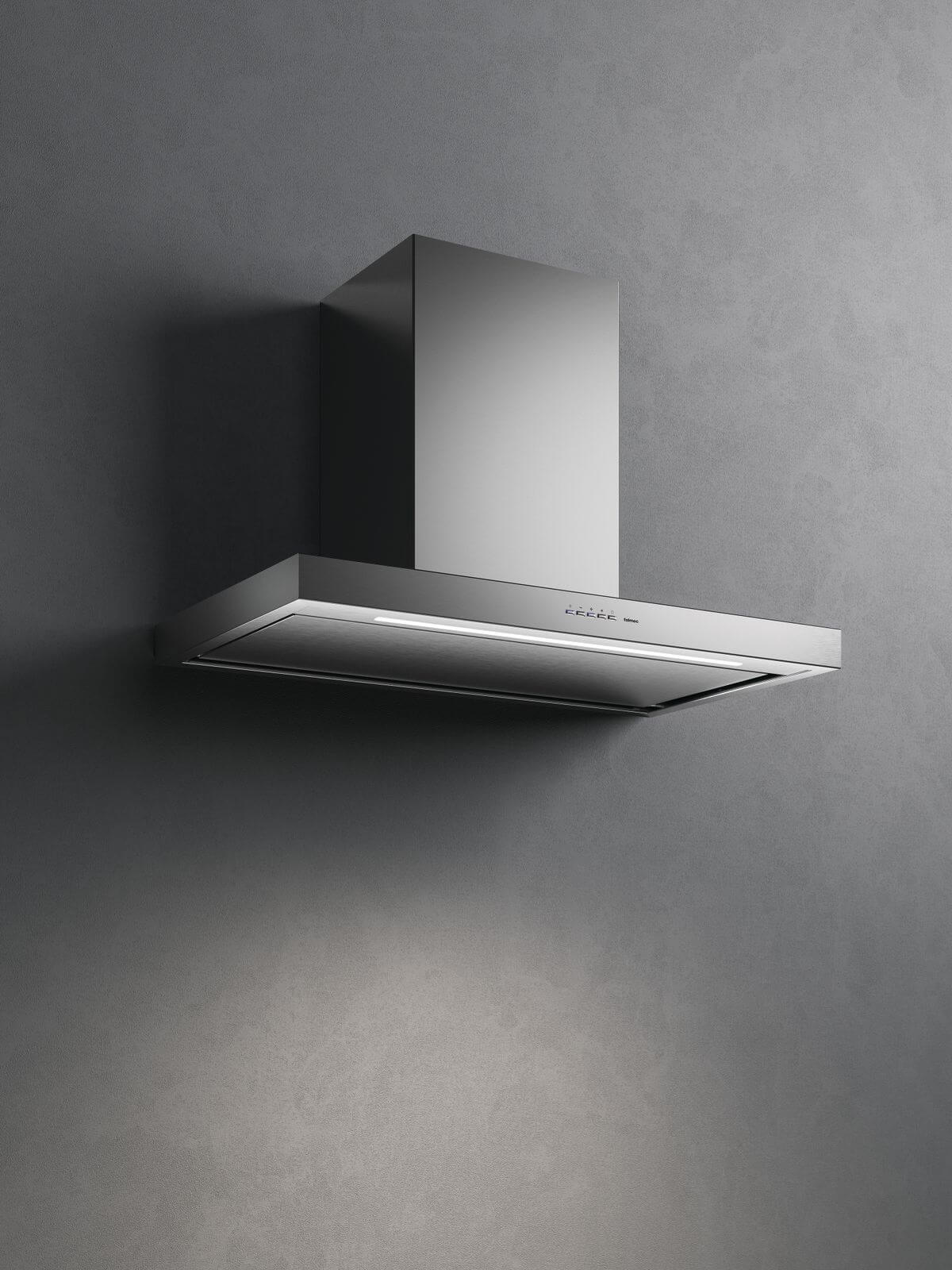Marke: FALMEC, Dunstabzugshaube, Einbauart: Wandhauben, Abluft, Umluft, Randabsaugen, Breitennorm: 90 cm, Farbe: Edelstahl, Energieeffizienzklasse: A, Beleuchtung: Ja; Dimmbare LED-Beleuchtung