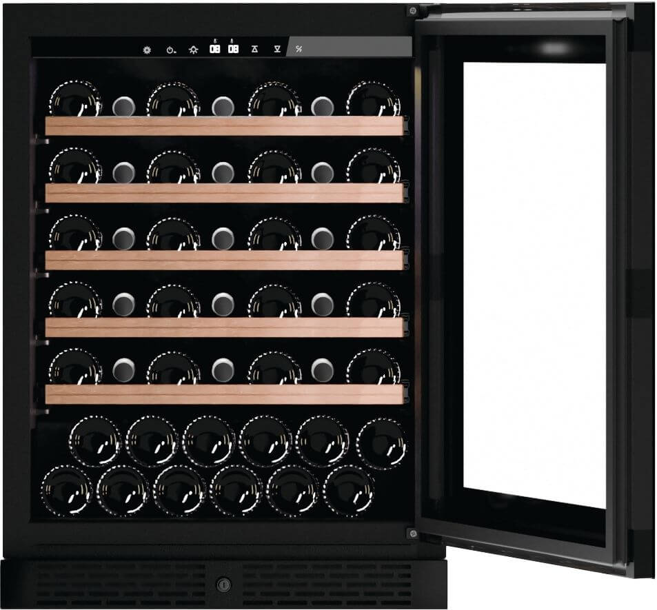 Marke: FORS, Weinkühlschrank freistehend FORS PREMIUM, Stand/Einbau: Standgerät, Farbe: Schwarz, Türtyp: Isolierglastür; Rahmen schwarz, Türanschlag: Rechts wechselbar, Klimaklasse: SN-T, Jahresverbrauch Energie: 104 kWh, Geräuschwert: 37 dB(A) re 1 pW, Geräuschemissionsklasse: C, Steuerung: hinter der Tür; Touch-Elektronik, Display: digital; LC-Display monochrom, Kühlsystem Weinteil: dynamisch, Umluft, Temperaturbereich Weinteil: 5 °C – 20 °C, Anzahl Klimazonen: 1, Anzahl Ablagen: 6, Aktivkohlefilter, Nutzinhalt Gesamt: 139 l, Anzahl Weinflaschen: 47, Beleuchtung: Ja; LED-Deckenbeleuchtung in kaltweiss