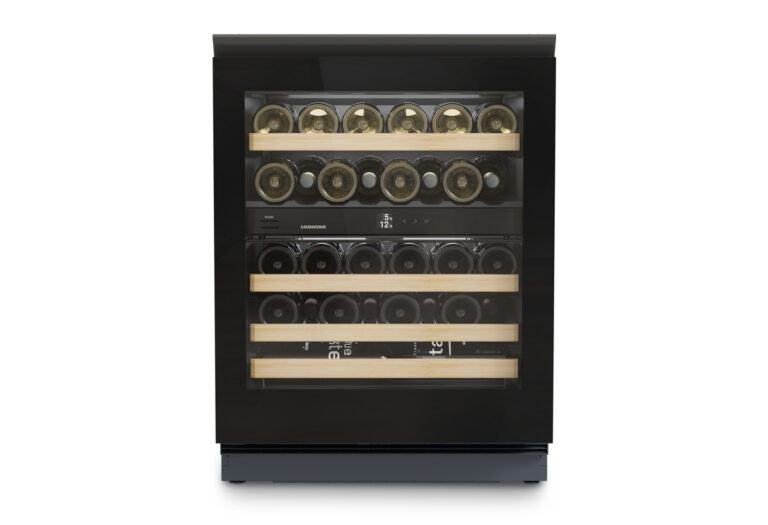 Einbau Weintemperierschrank mit TempProtect Plus, HumiditySelect, UVProtect, VibrateSafe, Touch-Display, BlackSteel Rückwand, FreshAir-Aktivkohlefilter, Metallbord mit Holzfront, Vibrationsarme Lagerung, Wechselbarer Türanschlag, 2 Zonen, Verstellbare Stellfüße, Displaysperre, Türalarm , GlassBlack mit horizontaler Griffmulde